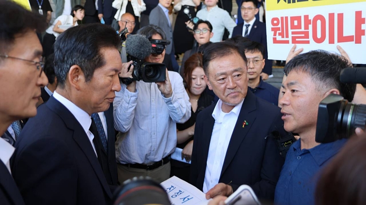 제주제2공항강행저지비상도민회의는 17일 오전 제주도청 앞에서 정청래 민주당 대표 등 지도부에게 제주 제2공항 관련 건의문을 제출했다. 비상도민회의 제공