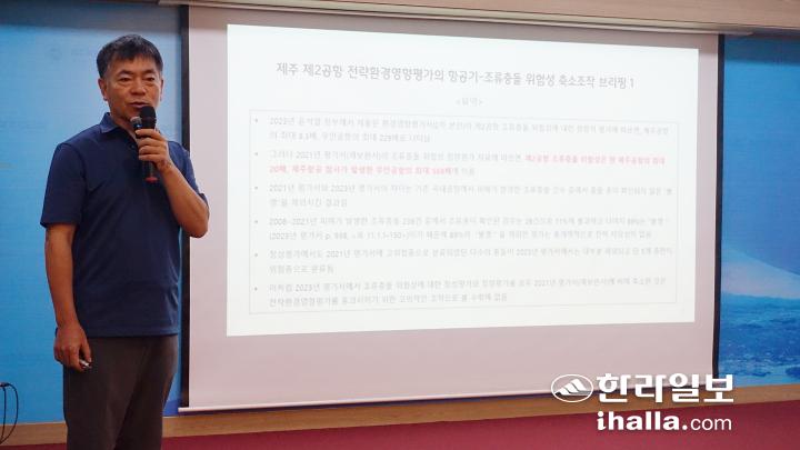 박찬식 제주제2공항강행저지비상도민회의 공동집행위원장이 22일 오전 제주도의회 도민카페에서 ‘제주 제2공항 전략환경영향평가 조작’ 브리핑을 진행하고 있다.