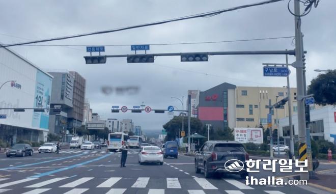23일 오전 11시 30분쯤 이도2동의 한 사거리 신호등에 전력이 끊긴 모습.