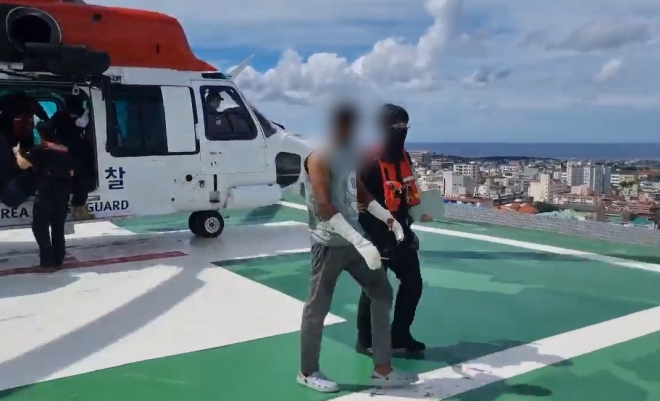 해경이 24일 오후 양팔에 2도 화상을 입은 외국인 선원을 병원에 인계하고 있다. 제주지방해양경찰청 제공