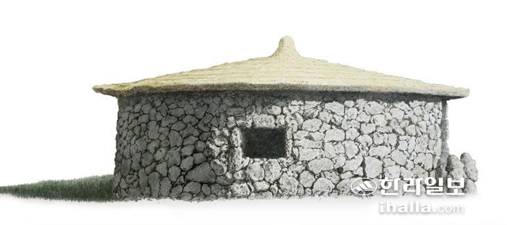 형태가 너무 감동적이다. 다른 마을들의 경우에 사각 모서리 초가집의 형태 속에 돌방아를 설치한 경우가 많지만 독특하게 제주어로 '눌'이라고 하는 낟가리를 닮았다. 돌을 둥근 벽으로 쌓은 과정이 더 많은 정성과 기술을 요구했으리라. 그래도 얻고자 하는 표현 욕구를 충족하기 위해 독특한 지붕을 획득하고 초가을 내리쬐는 햇살을 받은 건물은 참으로 정겹다. 입구에 작은 돌하르방상을 모셔서 수호의지를 드러내고. 마을공동체의 독립적 지위를 전달하는 메시지로 이 마을의 표상이라 여기며 그린 것이다. 원기둥 형태의 곡면을 이루니 돌담 사이 틈들이 어떤 의미를 지닌 기하학적 문양처럼 보인다.