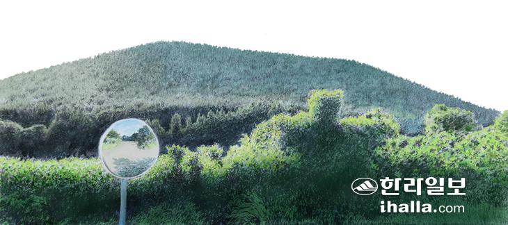 저 오름이 팔을 벌려 품은 것 같은 마을이기에 주변 자연 환경의 대표적 장면을 그린 것이다. 매력적인 포인트는 차량이 다니는 길가의 반사경이다. 대자연의 풍광 속에 인위적인 요인 하나가 화룡점정처럼 들어가 맛깔스런 공간적 생명력을 불어넣고 있다. 볼록거울이 생성시키는 상징성 또한 크다. 풍경의 맞은 편에 뻗어 있는 길마저 하나의 화폭 속에 들어올 수 있느니 야릇하다.