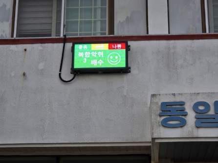 설치된 악취알림 전광판은 무인 악취측정기에서 수집된 데이터를 실시간으로 반영, 복합악취지수를 색상별(▷좋음:지수 1~7, 녹색 ▷보통:7~15, 주황색 ▷나쁨:15 이상, 적색)로 구분해 표시함으로써 주민과 축산농가가 현장에서 악취 상태를 한눈에 쉽게 확인할 수 있게 된다.