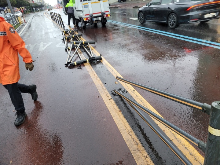 3일 오전 제주시 이도2동에서 중앙분리대가 강풍에 의해 전도됐다. 제주소방안전본부 제공