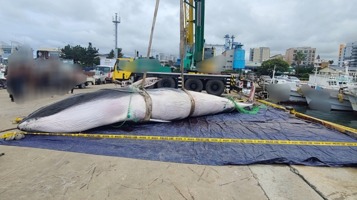 16일 오전 한림항 인근 바다에서 길이 10m, 무게 7t의 새끼 참고래 사체가 발견됐다. 제주해양경찰서 제공