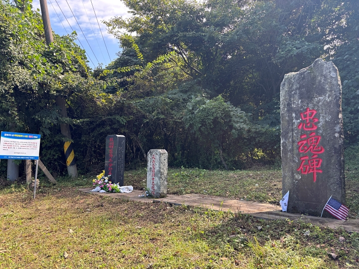 제주4·3 당시 민간인 학살을 주도한 함병선 제2연대장의 공적비. 비석 아래는 꽃과 태극기, 성조기 등이 놓여져 있다. 제주4·3기념사업위원회 제공