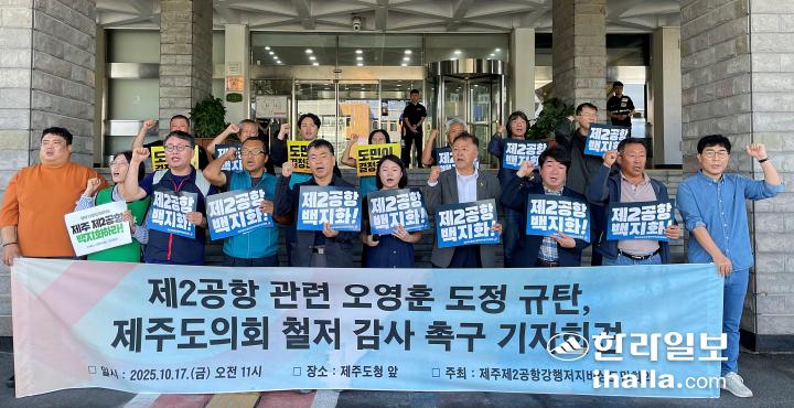 제주제2공항강행저지비상도민회의는 17일 제주도청 앞에서 기자회견을 열고 “제2공항 강행하는 오영훈 도정을 규탄한다”고 밝혔다.
