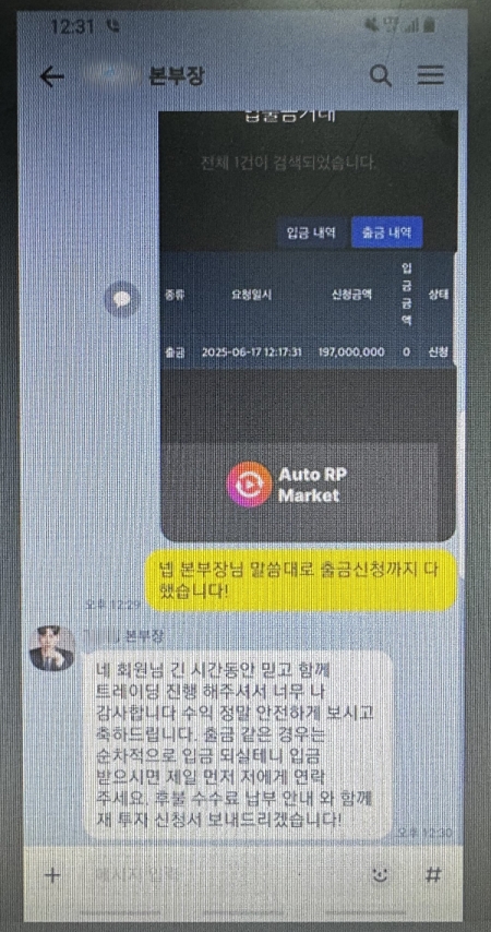 투자리딩 사기 조직이 피해자와 나눈 채팅.