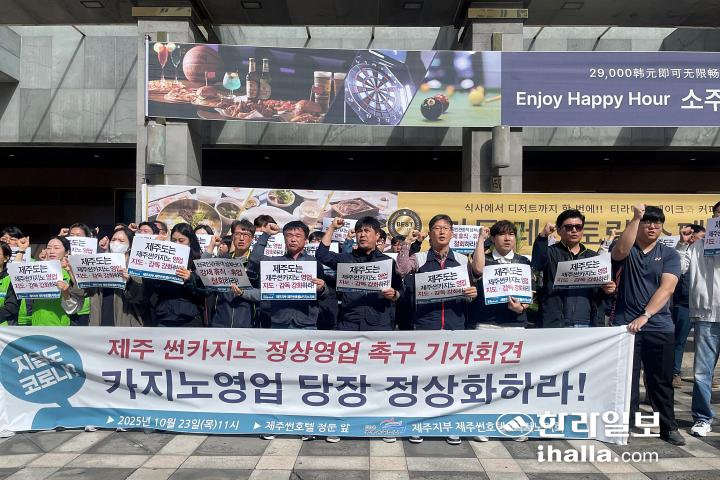 민주노총 공공운수노조 제주지부 제주썬호텔&카지노지회는 23일 오전 카지노 영업 정상화 기자회견을 열었다.
