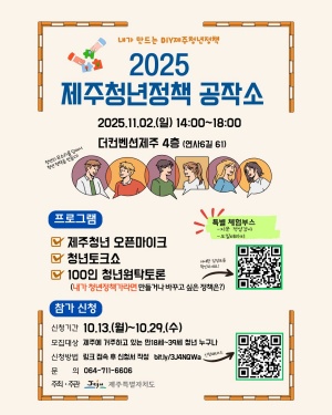 '2025 제주청년정책공작소'는 오는 11월 2일 오후 2시 더컨벤션제주에서 개최되며, 제주 청년정책의 현재와 미래를 논하고 청년이 직접 정책 아이디어를 발굴·제안하는 자리로 마련됐다.