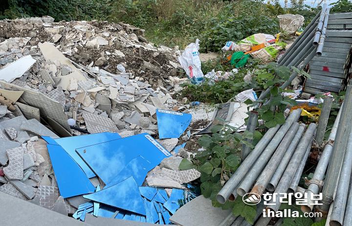 27일 제주시 오등동의 한 임야에 방치된 건설 폐기물들.