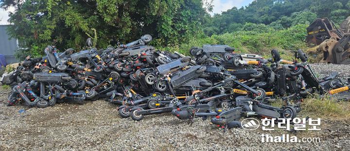 27일 제주시 오등동의 한 임야에 방치된 전동 킥보드들.