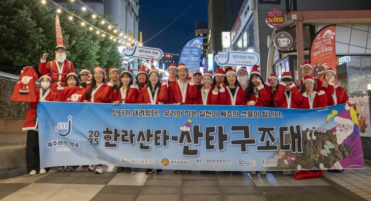 올해는 지난달 31일 제주시 누웨마루 거리에서 첫 정화활동이 열려 '2025 한라산타-산타구조대'의 첫 미션이 시작됐다. 이날 산타복을 입은 제주 청년 20여 명은 거리 곳곳의 담배꽁초와 일회용품 등을 수거하며 '깨끗한 제주 만들기'에 나섰다. 이른 저녁 짧은 활동 시간이었지만 수거된 쓰레기양은 50리터 마대 네 자루에 달했다. 더불어 산타구조대는 "쓰레기는 되가져 가주세요"라는 구호와 함께 방문객들에게 환경보호를 알리는 구두 캠페인도 진행했다.
