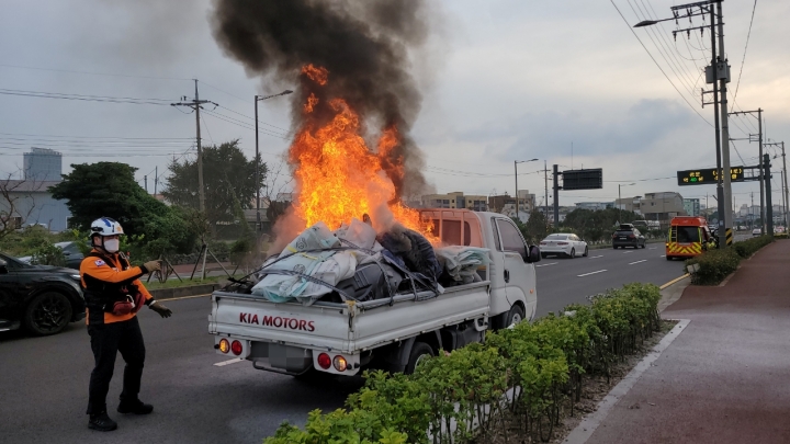 4일 오후 제주시 도두2동에서 60대 남성 A씨가 몰던 1t 트럭에서 화재가 발생했다. 제주소방안전본부 제공