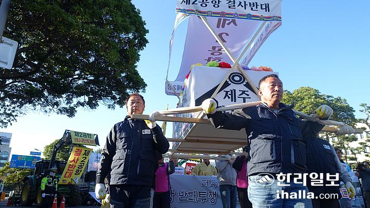 이들은 ‘제2공항 결사반대’, ‘제주가 죽어간다, 제2공항 철회하라’라는 문구의 현수막이 걸린 상여(喪輿)를 메고 제주도의회에서 도청 내부까지 약 500m를 행진했다. 대회 장소에 도착해서는 상여에 휘발유를 뿌리고 불을 붙여 모두 태웠다.