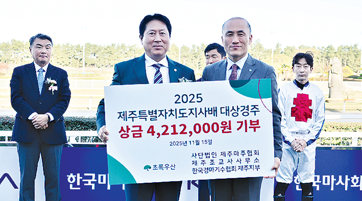 제주마주협회(회장 조경수), 제주조교사사무소(대표 강태종), 한국경마기수협회 제주지부(회장 한영민)는 지난 15일 렛츠런파크 제주에서 초록우산어린이재단과 사회복지공동모금회, 제주대 말산업전문인력양성센터에 각각 420여 만원씩 기부했다.