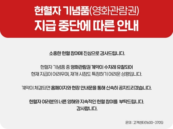헌혈자 기념품(영화관람권) 지급 중단에 따른 안내. 대한적십자사 혈액관리본부 홈페이지