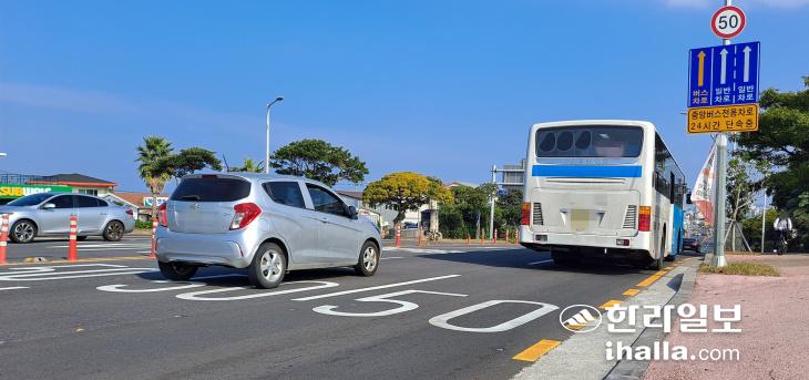 24일 제주도와 제주시에 따르면 서광로 구간(3.1㎞)은 지난 5월 BRT 고급화 사업 완료에 따라 가로변 버스전용차로제에서 중앙차로제로 변경됐다. 이에 기존 3차로에 위치한 버스전용차로가 1차로로 변경됐고, 이로 인해 운전자들이 혼란을 겪고 있다.