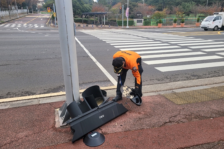 27일 오전 11시 9분쯤 제주시 노형동에는 신호등이 떨어져 소방이 안전조치에 나섰다. 제주소방안전본부 제공