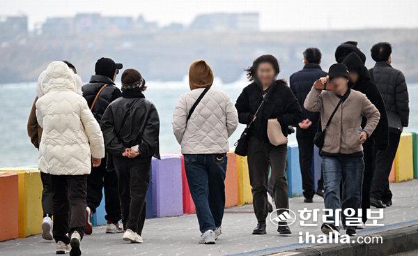 [한라일보] 27일 제주시 도두동 무지개 해안을 찾은 관광객들이 강한 바닷바람을 맞으며 걷고 있다. 강희만기자