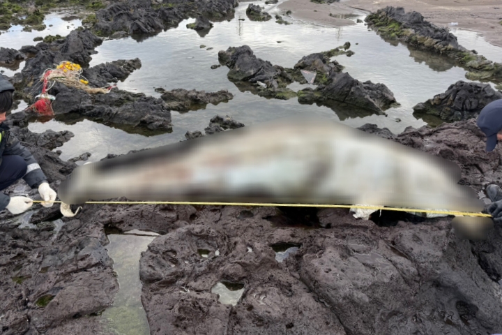 28일 오전 제주시 삼양해수욕장 인근 갯바위에서 남방큰돌고래 사체가 발견됐다. 제주해양경찰서 제공