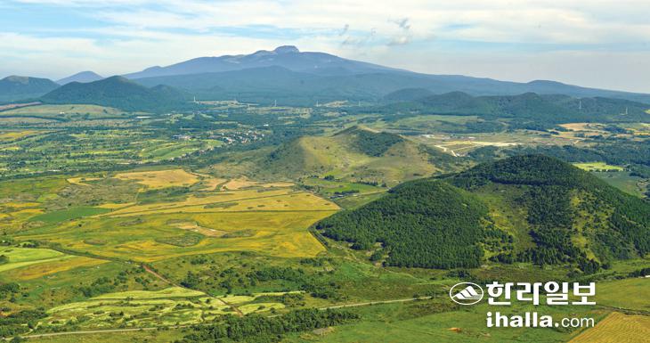 새별오름, 정면 가운데 풀밭으로 이루어진 오름, 오른쪽 아래는 이달오름. 사진 난대아열대산림연구소 김진 제공