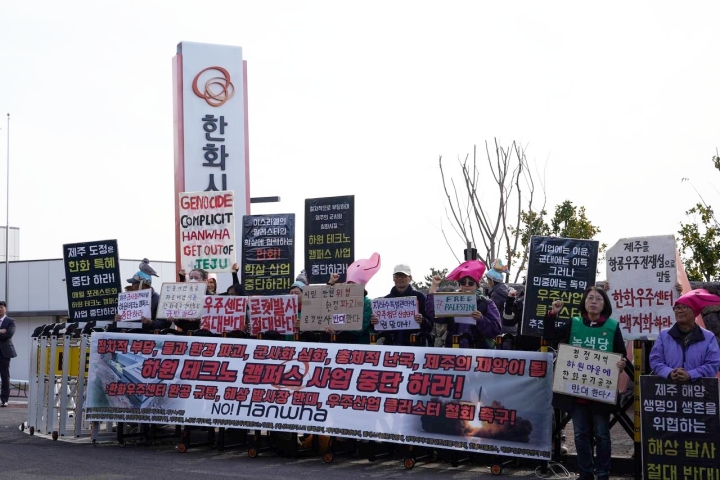 제주지역 15개 시민단체와 정당은 2일 서귀포시 하원동 구 탐라대 부지에서 ‘한화우주센터 완공 규탄 및 해상 발사장 반대’ 기자회견과 집회를 열었다. 강정친구들 제공