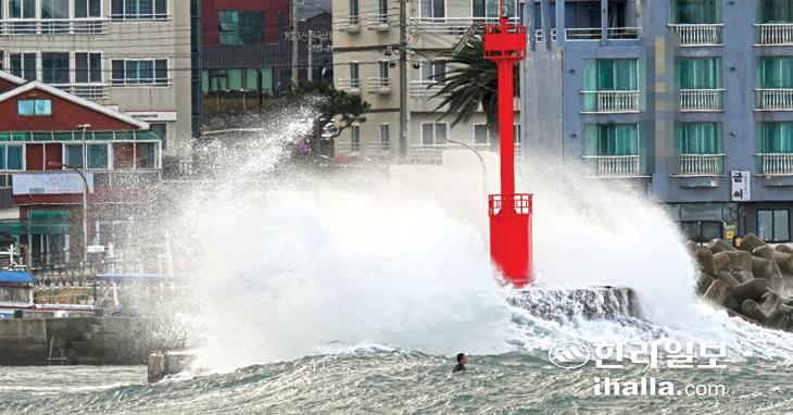 [한라일보] 제주 전 해상에 풍랑주의보가 내려진 3일, 제주시 이호포구에 높은 파도가 해안으로 밀려오고 있다. 강희만기자