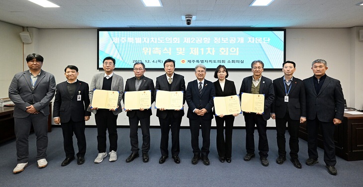 제주특별자치도의회는 4일 의회 소회의실에서 제2공항 정보공개 자문단 위촉식을 개최했다.