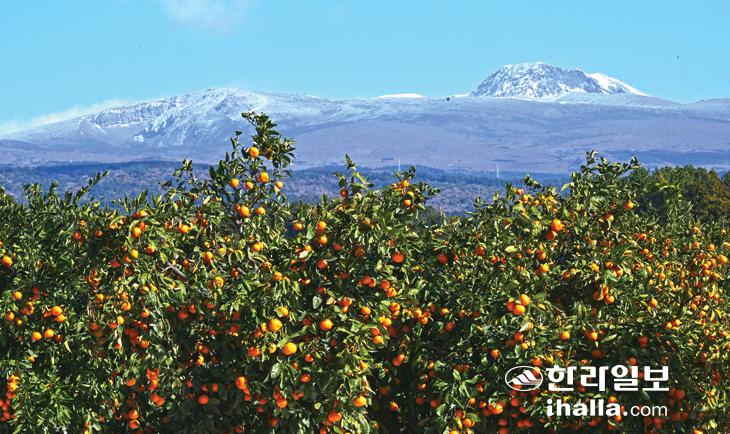 [한라일보] 최근 한라산 일대에 많은 눈이 내린 가운데 지난 5일 서귀포시 중문동 감귤원에서 바라 본 한라산이 만설을 이뤄 장관을 연출하고 있다. 강희만기자