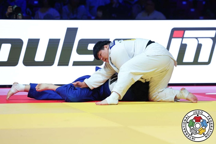 7일 2025 국제유도연맹(IJF) 도쿄 그랜드스램 이틀째 여자 +78㎏급 결승전에서 김하윤을 상대로 조르기를 시도하는 이현지(흰색). 국제유도연맹 제공