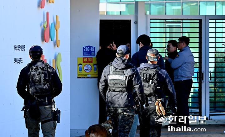 18일 제주첨단과학기술단지내 카카오 본사 건물에 폭파 협박이 있었다는 사측의 신고가 접수돼 경찰과 군이 수색에 나섰다. 강희만 기자