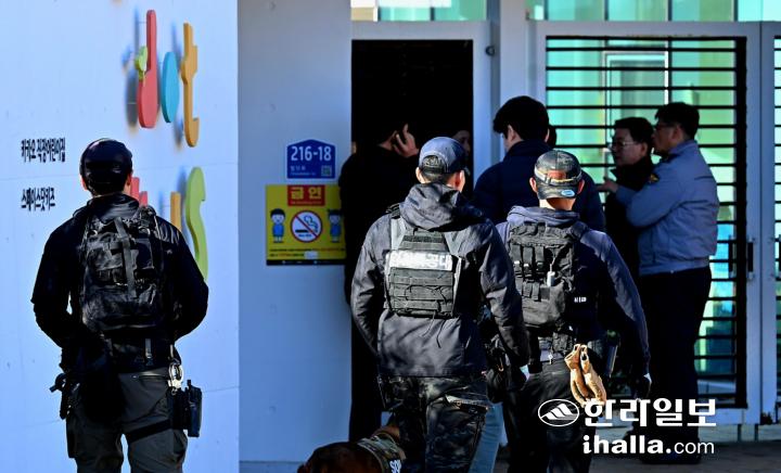 18일 오전 제주 카카오 본사에 폭발물을 설치했다는 협박 게시물 신고가 접수돼 경찰 특공대가 수색에 나섰다. 강희만기자