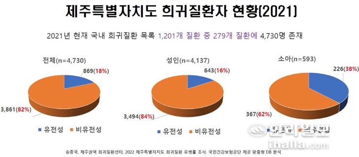 [한라일보] 희귀질환은 전국민 중에서 총 환자 수가 2만명 이하의 질환을 일컫는 말이다. 국내에선 현재 1389개의 희귀질환이 있다. 크게 두 종류로 나눌 수 있는데, 비유전성 희귀질환과 유전성 희귀질환이 그것이다. 제주특별자치도 희귀질환 유병률 조사에서 2021년 현재 4730명의 희귀질환 환자가 있고 이중 18%가 유전성 희귀질환이다.
