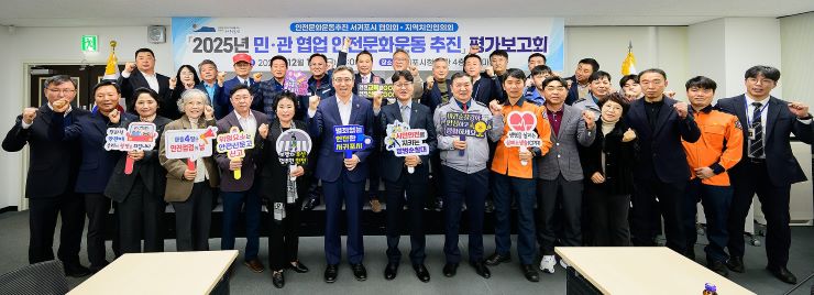 서귀포시는 지난 19일 별관 4층 회의실에서 교육지원청·경찰서·자치경찰단·소방서·해양경찰서 등 유관기관장과 시민사회단체장 등 안전문화운동추진 서귀포시협의회 위원 30여 명이 참석한 가운데 '2025년도 민·관협업 안전문화운동 추진 평가보고회'를 개최했다.