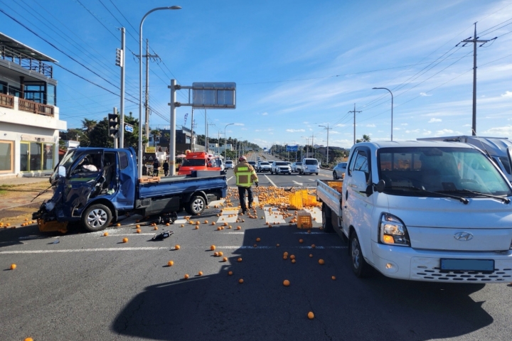 22일 오전 서귀포시 표선면 토산리의 한 도로에서 1톤 트럭 두 대가 부딪혀 운전자 2명이 중경상을 입었다. 제주소방안전본부 제공