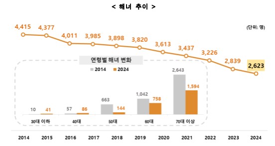 제주 해녀 인구는 2014년 이후 매해 감소세다. 2014년 4415명에서 2024년 2623명으로 1792명(40.6%) 줄었다. 연령별로는 40대 이하는 증가했지만 50대 이상은 모두 감소했으며 특히 70대 이상 감소세가 두드러졌다. 지난해 기준 해녀는 30대 이하 41명, 40대 86명, 50대 144명, 60대 758명, 70대 이상 1594명으로 2014년 대비 30대 이하는 31명, 40대는 29명 증가한 반면 50대는 519명, 60대는 284명, 70대 이상은 1049명 각각 줄었다.
