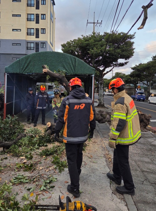 26일 오전 7시21분쯤 서귀포시 하효동에서 나무가 강풍에 의해 쓰러져, 소방당국이 안전조치에 나서고 있다. 제주소방안전본부 제공