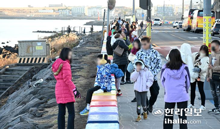 [한라일보] 28일 제주시 도두동 무지개해안도로를 찾은 외국인 관광객들이 청정 제주 겨울을 만끽하고 있다. 강희만기자