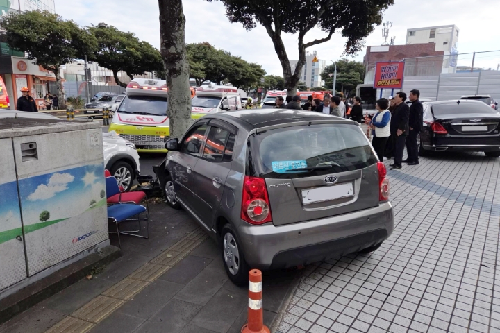 지난 28일 오후 서귀포시 동홍동에서 80대 운전자 A씨가 몰던 차량이 인도의 가로수로 돌진해 3명이 다쳤다. 제주소방안전본부 제공