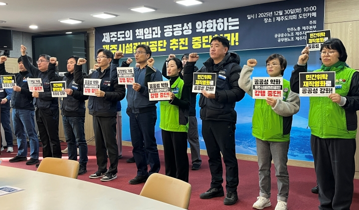30일 제주지역 노동단체들이 제주시설관리공단 추진 중단을 촉구하는 기자회견을 열었다.