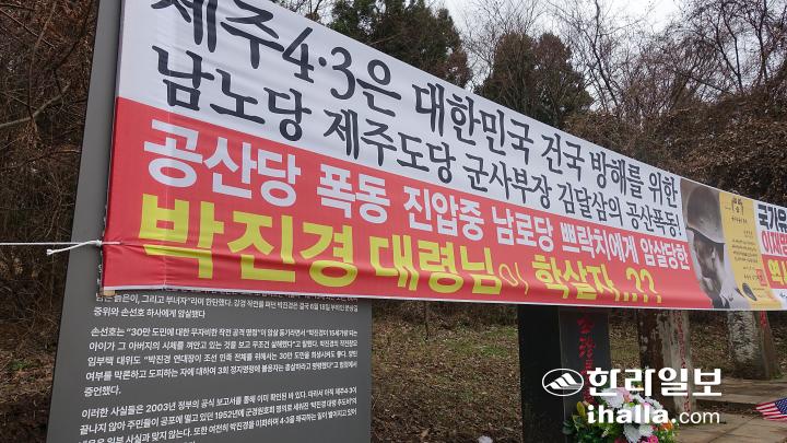 [한라일보] 제주4·3 당시 강경진압을 주도했던 고(故) 박진경 대령의 추도비 ‘바로 세운 진실의 비’가 세워졌으나 이를 모두 가리는 4·3왜곡 현수막이 보름이 채 되지 않은 시점에 설치된 것으로 드러났다.