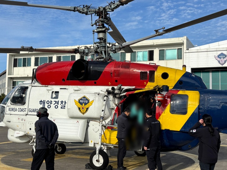 제주해경이 한라산 삼각봉 인근에서 응급환자를 구조, 제주공항 119에 인계하고 있다. 제주해경 제공
