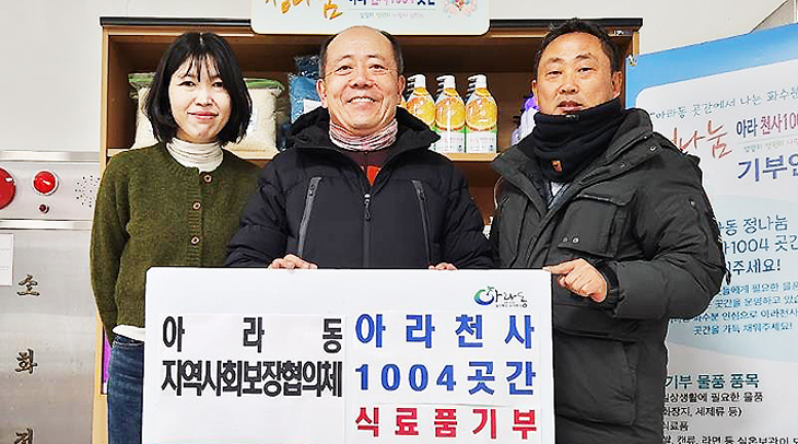 제주시 아라동지역사회보장협의체는 최근 '아라천사1004곳간'에 지역 내 어려운 이웃을 위한 식료품을 기탁했다. 현치하 아라동장은 "소중한 나눔에 동참해 준 협의체 위원들에게 깊이 감사하며, 물품은 도움이 필요한 이웃들에게 잘 전달하겠다"고 말했다.
