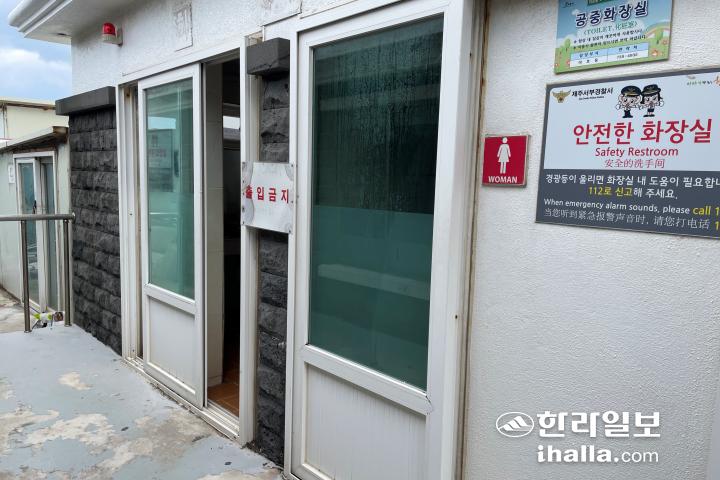 지난 7일 제주시 이호1동의 현사포구 인근 폐쇄된 공중화장실 외부. 신축 화장실을 안내하는 문구가 지워져 보이지 않는다. 양유리기자