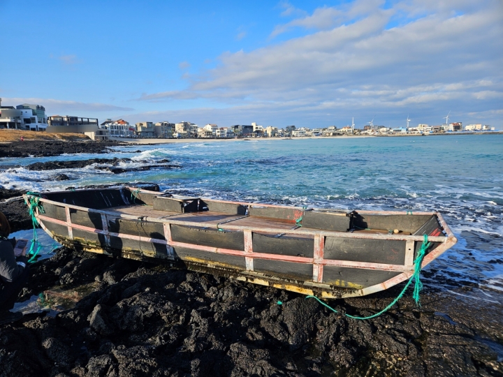 12일 오전 제주시 구좌읍 월정리해수욕장에서 의문의 목선이 발견됐다. 제주해양경찰서 제공