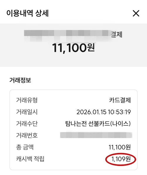 15일 탐나는전 카드를 사용해 한 매장에서 결제하자 10% 캐시백이 1원 덜 적립됐다.