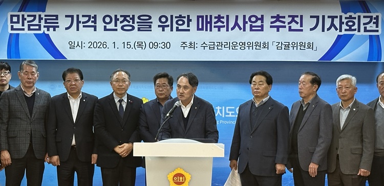 제주농산물수급관리운영위원회 산하 감귤위원회는 15일 제주도의회 도민카페에서 기자회견을 가졌다. 제주농산물수급관리센터 제공