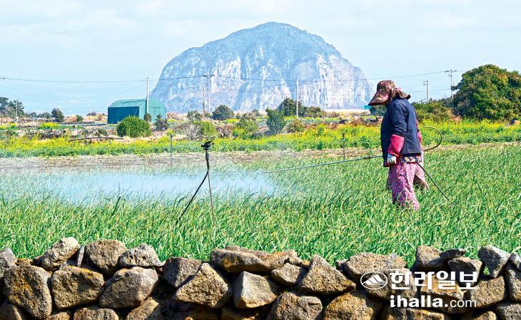 [한라일보] 15일 서귀포시 대정읍 무릉리의 한 농경지에서 농민들이 병충해 예방을 위한 농약 살포 작업을 하고 있다. 강희만기자