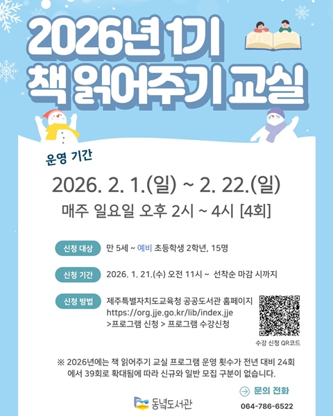 [한라일보] 동녁도서관이 내달 1일부터 22일까지 '2026년 1기 책 읽어주기 교실'을 운영한다.